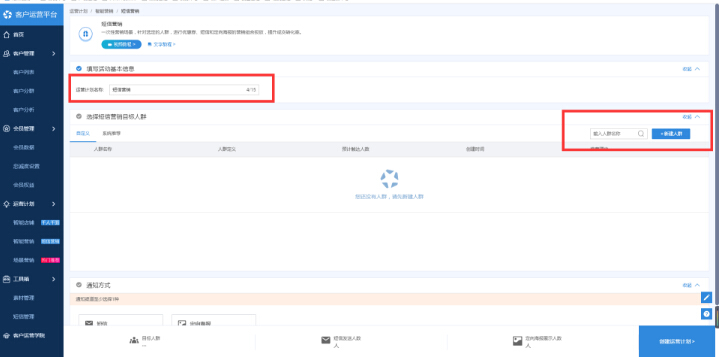 设置方法:登录客户运营平台,进入智能营销标签页,点击“短信营销”功能入口“立即创建”进入自定义营销功能配置页面;第一步:创建计划名称并选择人群;在明确我们自己的营销目的之后,选择好想要营销的人群,点击添加人群,人群保存之后,这个人群会出现在自定义列表里面,选中确定,便完成了人群创建和选择的过程;在人群添加好之后,会在编辑页面看到人群的人数,人群中的所有人都可以进行优惠券和定向海报的营销,人群中有历史成交的用户可以进行短信营销;