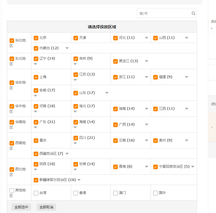 投放地域除了其他地区中的港澳台以及国外等地,全选,因为是测款你不知道在哪个地域你的宝贝有点击有转化,之后看点击展现转化的数据逐步精准地域。