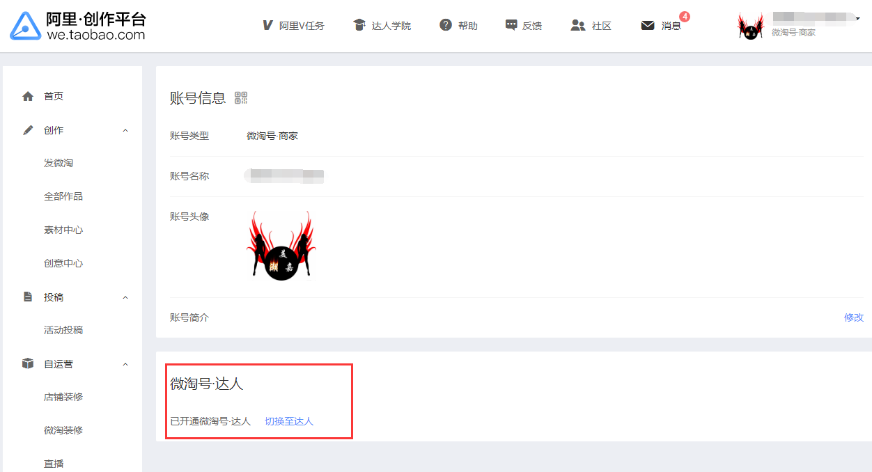 右上角会提示,你是微淘号-商家,需要开通微淘号-达人,才能进行双身份的切换,进入账号设置里面,没有开通的话,这里会显示未开通,需要点击去开通,已经开通过,可以直接切换到微淘号达人界面。